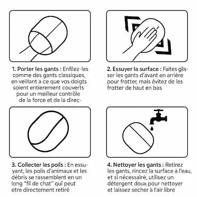 Trek gewoon de handschoen aan en wrijf met uw hand over het te reinigen oppervlak (of over het dier) met eenvoudige bewegingen in één richting. De haren verzamelen zich op natuurlijke wijze in een compacte strook die u in één keer kunt verwijderen. Zonder lijm, zonder batterijen, zonder moeite.